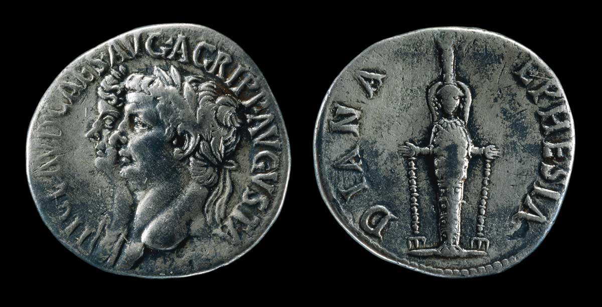 The cult that developed at Ephesus displays several clear influences from the east, including features normally associated with goddesses such as Isis and Cybele. On coins minted by the city, the statue of Artemis is depicted wearing a mural crown (i.e. the city’s walls). This is an attribute shared with Cybele, who was also viewed as a protector of cities. These specificities, such as her representation as being covered round objects, often understood to be eggs (linked to her role as a fertility deity) or breasts, ensure that this goddess is referred to specifically as the Artemis Ephesia, or the Ephesian Artemis. Because the Romans simply adopted the worship of the goddess as part of their typical religious syncretism, it is also common to find the goddess referred to as Diana Ephesia (Diana was the Roman equivalent of Artemis).