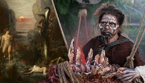 The Hydra was a gigantic serpent with numerous heads—the number varies according to different sources—that resided in Lerna’s lakes. The water-dwelling monster is said to have blood and poisonous breath.