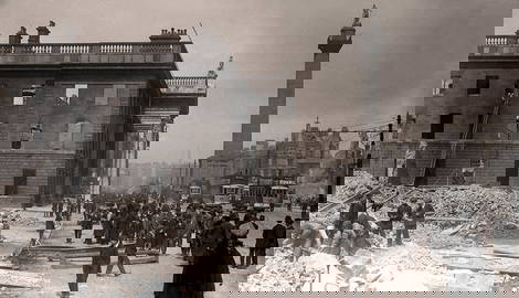 On Tuesday, Pearse stood in front of Nelson’s Pillar on O’Connell Street and read out a manifesto to the citizens of Dublin, summoning their support for the Easter Rising. However, because the rebels had failed to take Dublin’s two main railway stations or its two ports, the British were able to bring in thousands of troops from the Curragh in County Kildare, Belfast, and Britain. The British had 16,000 troops in Ireland by the end of the week. The British began firing at rebel positions at Liberty Hall, Boland’s Mill, and O’Connell Street on Wednesday. There was surprisingly little fighting at the General Post Office, the Four Courts, Jacob’s Biscuit Factory, and Boland’s Mill.