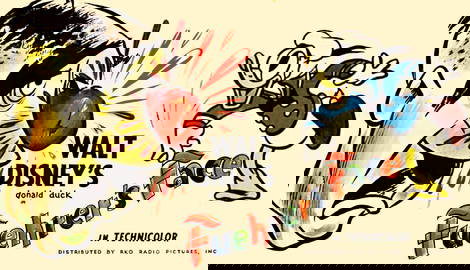 Released in 1943, Der Fuehrer’s Face starred Donald Duck suffering from a nightmare. He becomes the citizen of an absurdist “Nutzi land” controlled by the Axis Powers and salutes Hitler, Mussolini, and Hirohito every morning before breakfast. In the short film, Donald Duck, held at bayonet-point and driven mad by his tireless work in a Nazi munitions factory, wakes up in bed in his red, white, and blue-striped pajamas. With a sigh of relief, Donald Duck kisses and hugs a figurine of the Statue of Liberty, elated that the United States is still free.