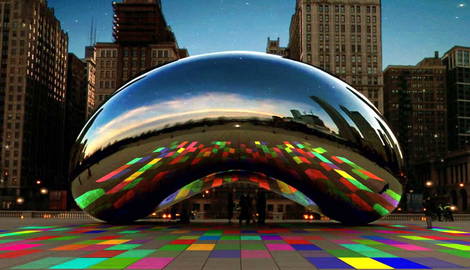 Known colloquially as “The Bean” for its curious elliptical shape, Anish Kapoor’s Cloud Gate, 2004-6, is in the AT&T Plaza at Millennium Park in Chicago. Kapoor made this monolithic sculpture from 110 tons of highly polished stainless steel, which he shaped into a mirrored infinity loop that curves around itself. Cloud Gate is 66 feet long and 33 feet high, making it one of the largest public artworks in existence. In keeping with the spirit of public art, Kapoor encourages visitors to interact with the work, and to see themselves and the world around them reflected back in a variety of distorted new ways.