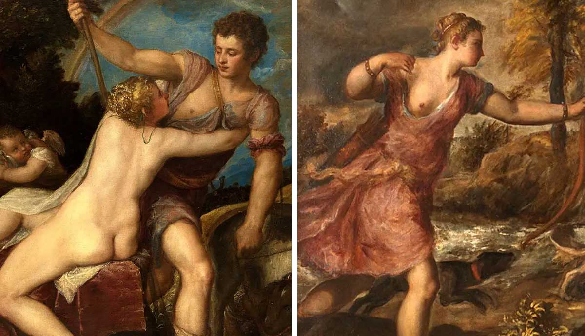 Diana towers over her, firmly pointing with authoritarian command, gesturing to suggest Callisto’s banishment from her entourage. Titian’s painting is awash with rippling light, which plays across the naked skin of the women, and onto the draped fabrics and lush scenery beyond, with increasingly fluid brush marks.
