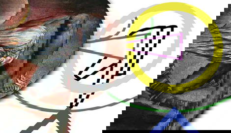 In the diagram, a blue line shows an omega shape that’s part of the structure, and its simplicity balances greater complexity in other areas. The shape of the donkey is shown in orange to highlight that it has a similar shape to the woman’s arms, which are part of the focal point area. Repeating the shape of a line can link the different areas of the work together, so in this piece, the shape of the donkey subtly guides the viewer to look at the focal point, the group of figures. The yellow in the diagram shows a shape in the structure that is repeated around the main focal point, and this is another technique that encourages the viewer to look at that area. When an artist uses different techniques to guide the viewer to the same focal point, the artwork has a clear and organized composition.