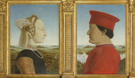 In the Netherlands and France, the diptych was almost exclusively used as a portable devotional object. However, in various city-states and regions of Italy, its purpose was to celebrate status and political achievements. Perhaps the most famous of these pairs of paintings is that of Federico da Montefeltro and his wife, Battista Sforza. Painted by Piero della Francesca, a close friend of the couple, its composition harks back to the traditional 14th-century portrait medals, with the subjects facing one another in profile.