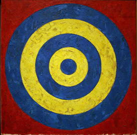 Like flags, targets were another recurring motif in Jasper Johns’ art, part of a formal repertoire he called “things that are seen and looked at, not examined.” He chose the target because he saw this symbol as closely associated with American life during the mid-20th century. His bold, brightly colored targets contrasted sharply with the prevailing preference for Abstract Expressionism that was dominating the American art world during this time. In turning his back on expressionism for a flat, clean brand of symbolism drawn from daily life, he opened up new pathways for making art from the detritus of everyday life, proving that just about any familiar object or motif could be brought into the gallery space.