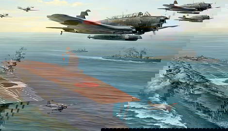 Imperial Japan entered World War II with the December 8th attacks on Pearl Harbor and other Asian countries. The First Air Fleet hit Pearl Harbor, as the U.S. Navy was deemed the biggest Pacific threat. The pilots and crews explicitly trained for this attack, using mockups of the American base. Some three hundred sixty planes in two waves sank four battleships but did not find the crucial American carriers.