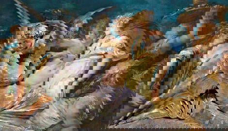 The years rolled by and yet Psyche could not find a husband. Instead, men simply worshipped her as if she were a goddess. Eventually Psyche’s parents visited the oracle of Apollo to ask what could be done. The oracle instructed them to dress their daughter in funerary clothing and stand on a mountaintop, where she would meet her future husband, a horrible serpent that was feared by everyone. Terrified, they carried out the task, leaving poor Psyche to her dreadful fate. While on the mountaintop, Psyche was carried by the breeze to a distant grove, where she fell asleep. On waking, she found herself near a palace made of gold, silver and jewels. An invisible male voice welcomed her in, and told her the palace was her home, and he was her new husband.
