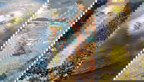 Maurice Denis was part of a group of Symbolist painters who called themselves Les Nabis. The name, translated from Hebrew as prophets signified their new approach to painting. Inspired by traditional forms of craft like ceramics or tapestry weaving, as well as Japanese decorative art, they sought to overcome the boundaries of easel painting. For them, interior designs and small decorations had the same value and potential as the art exhibited in galleries.
