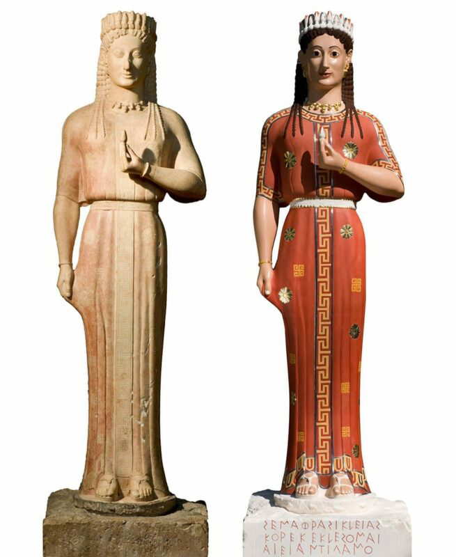 Much of our knowledge of ancient greek clothing comes from marble sculptures. That is why many people assume that people in ancient Greece wore exclusively white clothes. When seen on statues or in painted pottery, the clothing often appears to be white or monochrome. However, it has been proved that the faded color of the marble statues was once covered with paint that wore off over the centuries.
