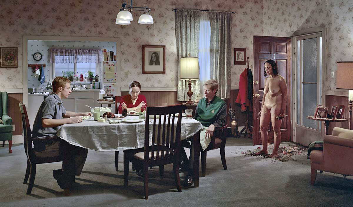 The American photographer Gregory Crewdson found the uncanny in small things. As a former psychology student, he knows how to construct a sense of unease in seemingly familiar and comforting situations. He frequently uses nudity as a marker of something inherently wrong in his compositions. In situations that do not usually involve the presence of a naked body (such as a normative and unremarkable family dinner with a hint of tension between family members), the sudden appearance of realistic physicality turns into a signal for danger, tragedy, or horror. The feeling of unsafety within one’s own home is one of the most effective and traumatizing methods of provoking fear, and Crewdson makes perfect use of it.